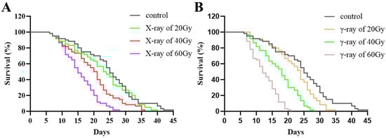 Survival curves of Aedes aegypti males irradiated with different doses of X-rays (A) and γ-rays (B).