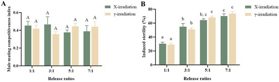 After 60 Gy of X-rays and 40 Gy of γ-rays irradiation, the male mating competitiveness was C = 0.45 ± 0.12, and there was no statistically significant difference in C at any different release ratios (Figure 4A, F = 0.364, df = 7, p = 0.906).