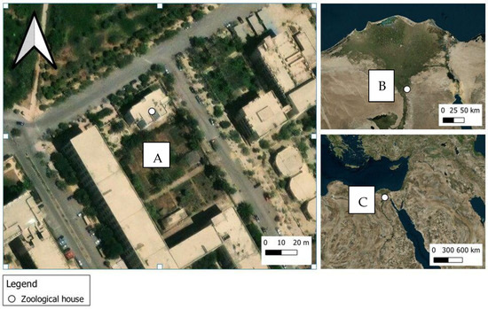 Maps showing the location of the study site. (A): College of Science garden, Al-Azhar University Nasr City, Cairo, where the study was carried out. (B): Cairo. (C): Egypt.