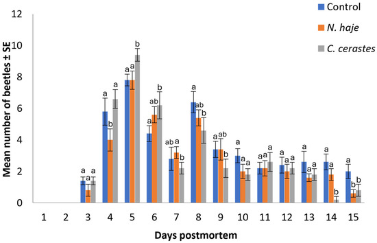 Mean number of beetles attracted to rabbit carcasses upon envenomation with snake venoms throughout the experimental period (15 days). Error bars represent the SE of means of 5 replicates (n = 5), using 5 different individual rabbits in each treatment. For each day, bars followed by different letters denote significant differences in the mean number of beetles (Kruskal–Wallis H-test, Dunn’s test, p < 0.05).
