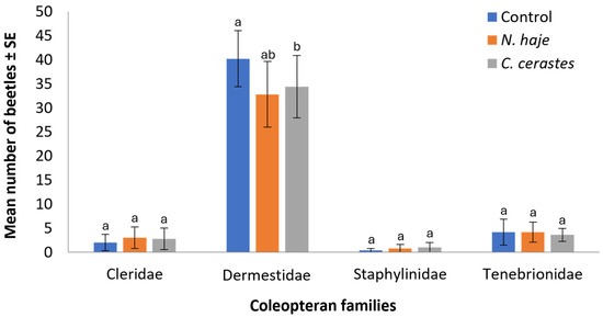 Mean number of recorded coleopteran families upon envenomation with snake venoms throughout the experimental period (15 days). Error bars represent the SE of means of 5 replicates (n = 5), using 5 different individual rabbits in each treatment. For each family, bars followed by different letters denote significant differences in the mean number of beetles (Kruskal–Wallis H-test, Dunn’s test, p < 0.05).