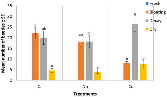 Mean number of recorded beetles in each decomposition stage. Error bars represent the SE of means of 5 replicates (n = 5), using 5 different individual rabbits in each treatment. C: control carcasses; Nh: N. hajie-envenomed carcasses; Cc: C. cerastes-envenomed carcasses. Different letters above bars indicate significant differences in beetle abundance between treatment groups within each decomposition stage (Kruskal–Wallis test followed by Dunn’s post hoc test, p < 0.05).