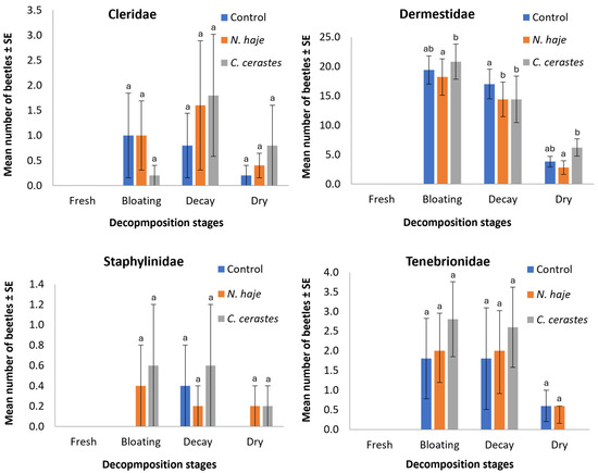 Figure 5 illustrates the effects of envenomation on the mean number of individuals within each family throughout the four stages of decomposition. All known beetle families were present in varying amounts during carcass decomposition. In the fresh stage, no beetles were recorded. The mean number of beetles within Cleridae in carcasses envenomed with N. haje and C. cerastes was 1.0 ± 0.69 and 0.2 ± 0.2, 1.6 ± 1.29 and 1.8 ± 1.22, and 0.4 ± 0.25 and 0.8 ± 0.8 during the bloating, decay, and dry stages, respectively, compared to 1.0 ± 0.85, 0.8 ± 0.65, and 0.2 ± 0.2 in the non-envenomed carcasses for the same stages. The highest number of beetles was recorded within Dermestidae, with the mean number recorded in envenomed carcasses being 18.2 ± 3.11 and 20.8 ± 2.98, 14.4 ± 2.96 and 21.6 ± 3.95, and 2.8 ± 1.16 and 6.2 ± 1.47 during the bloating, decay, and dry stages, respectively, compared to 19.4 ± 2.39, 17.0 ± 2.53, and 3.8 ± 0.91 in the non-envenomed carcasses for the same stages. For Staphylinidae, the mean number recorded in the envenomed carcasses was 0.4 ± 0.4 and 0.6 ± 0.6, 0.2 ± 0.2 and 0.6 ± 0.6, and 0.2 ± 0.2 and 0.2 ± 0.2 in the bloating, decay, and dry stages, respectively, compared to 0.0 ± 0.0, 0.4 ± 0.4, and 0.0 ± 0.0 in the non-envenomed carcasses. Regarding Tenebrionidae, the mean number recorded in envenomed carcasses was 2.0 ± 0.81 and 2.8 ± 0.96, 2.0 ± 1.09 and 2.6 ± 1.02, and 0.6 ± 0.45 and 0.0 ± 0.0 during the bloating, decay, and dry stages, respectively, compared to 1.8 ± 1.02, 1.8 ± 1.29, and 0.6 ± 0.4 in the non-envenomed carcasses for the same stages. Dermestidae showed the most pronounced differences among groups and was the only family exhibiting statistically significant variations (H = 9.01–11.79, df = 2, p = 0.003–0.011). The remaining three families showed no significant differences across treatments in any decomposition stage (H = 1.07–5.38, df = 2, p = 0.068–0.584).