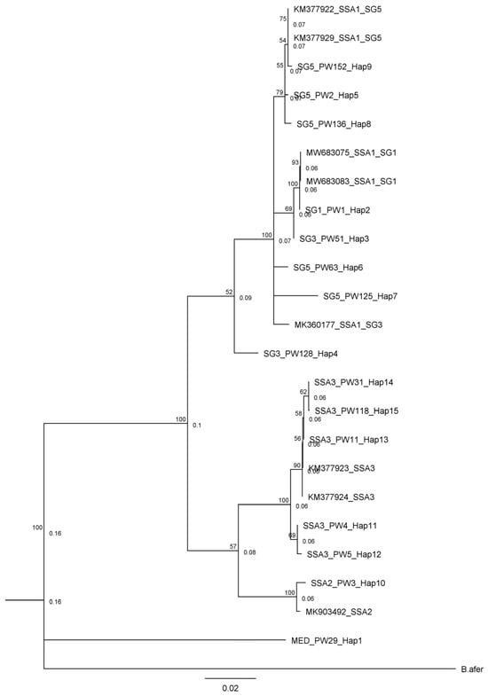 For the genotyping analysis, the mitochondrial cytochrome C oxidase I (mtCOI) gene of each whitefly was amplified using the primer pair 2195Bt (5′-TGRTTTTTTGGTCATCCRGAAGT-3′) and C012/Bt-sh2 (5′-TTTACTGCACTTTCTGCC-3′) [9]. The PCR reaction mixture (50 µL) contained 10× PCR reaction buffer, 10 mM dNTPs, 10 µM of each primer, and 1 U Taq DNA Polymerase. The reaction cycle for the 2195Bt and C012/Bt-sh2 primer pair was an initial denaturation of 94 °C for 2 min, 35 cycles of denaturation at 94 °C for 20 s, annealing at 52 °C for 30 s, elongation at 72 °C for 1 min, final extension of 10 min at 72 °C, and hold at 4 °C. The PCR products were resolved on 1% (w/v) agarose gel in 1× TAE stained with ethidium bromide (10 mg/mL) and visualized using a UV gel documentation system (UV light 302 nm) (Analytik Jena, Jena, Germany). Amplicons with the expected band size were purified using the Easytaq DNA purification kit (TransGen Biotech, Beijing, China) following the manufacturer’s instructions and sequenced using the Sanger method (Inqaba Biotech, Ibadan, Nigeria).