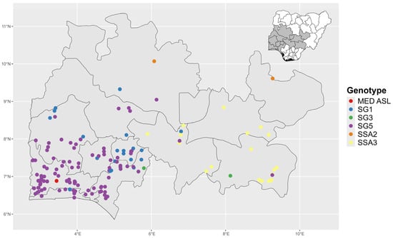 Distribution of whitefly (B. tabaci) genotypes in cassava farms in South West and North Central, Nigeria. SSA—Sub-Saharan African. SG1—SSA1 subgroups 1; SG3—SSA1 subgroups 3; SG5—SSA1 subgroups 5.