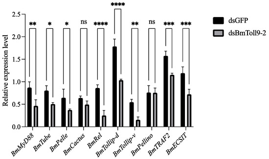 The relative expression of signaling genes in the Toll pathway after the RNAi of BmToll9-2. Larvae of the 5th instar were injected with dsBmToll9-2, and dsGFP served as a control. Data are represented as the means ± standard deviations of three biological replications. Asterisks indicate significant differences from dsGFP injection groups: * p < 0.05; ** p < 0.01; *** p < 0.001; and **** p < 0.0001. ns, not significant.