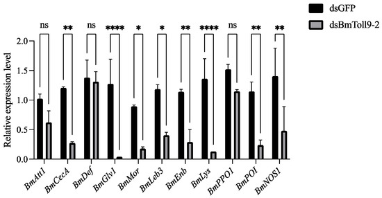 The relative expression of immune effector genes after the RNAi of BmToll9-2. Larvae of the 5th instar were injected with dsBmToll9-2, and dsGFP served as a control. Data are represented as the means ± standard deviations of three biological replications. Asterisks indicate significant differences from dsGFP injection groups: * p < 0.05; ** p < 0.01; and **** p < 0.0001. ns, not significant.
