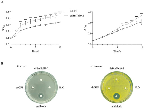 Antibacterial activity assays of B. mori hemolymph against E. coli and S. aureus after RNAi of BmToll9-2. Hemolymph was collected 24 h after dsRNA injection and tested for antibacterial activity. (A) Bacterial growth curve experiment. (B) Inhibition zone experiment. dsBmToll9-2: hemolymph from larvae injected with dsBmToll9-2; dsGFP: hemolymph from larvae injected with dsGFP; H2O: sterile water; antibiotic: ampicillin. Asterisks indicate significant differences from dsGFP injection groups: * p < 0.05 and *** p < 0.001.