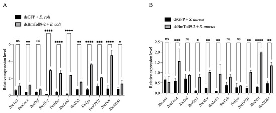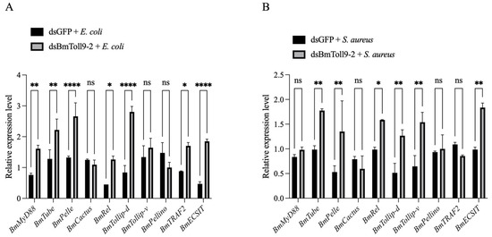 The relative expression of signaling genes in the Toll pathway following challenges with heat-inactivated bacteria after the RNAi of BmToll9-2. Larvae of 5th instar were injected with dsBmToll9-2 or dsGFP. Then, the larvae were fed with heat-killed (A) E. coli or (B) S. aureus. Data are represented as the means ± standard deviations of three biological replications. Asterisks indicate significant differences from dsGFP injection groups: * p < 0.05; ** p < 0.01; and **** p < 0.0001. ns, not significant.