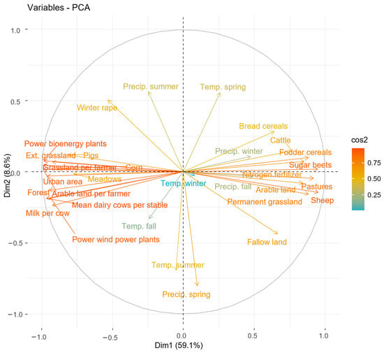 The PC3 showed relatively low cosine values for most variables, indicating limited representation of any single variable. Significant and opposite loadings for “Cattle” and “Meadows” can be observed, but the overall weak representation suggests that PC3 may capture less relevant patterns in the data (see Supplementary File S6, Figure S1C). Similarly to PC2, PC4 and PC5 were primarily influenced by climate variables; however, the generally exhibited low cosine values (see Supplementary File S6, Figure S1D,E), indicating limited explanatory power and weak associations with the original variables.
