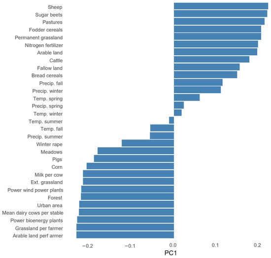 In the PCA with the full biomass dataset and reduced variable set, the first principal component (PC1) can be broadly described as an “agricultural intensification and land use change gradient” (Figure 2 and Figure 3). This component is characterized by high negative loadings for variables associated with intensified agricultural practices, such as tons of milk per cow, power of energy in plants, and arable land cultivated per farmer. Conversely, PC1 exhibits positive loadings for variables indicating extensive agricultural practices, including the area of pastures, permanent grassland, and the number of sheep. Further, the component also includes land uses, with negative loadings of increases in urban areas and forest and positive loadings of total arable land. Overall, the high cosine square values (see Supplementary File S6, Figure S1A) of variables with high absolute loadings in PC1 (Figure 3) demonstrate a strong representation of agricultural intensification and land use change in this component.