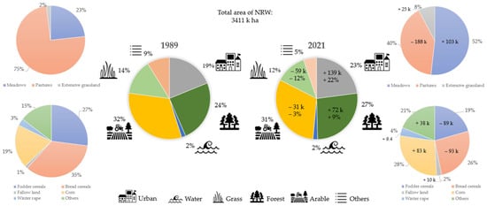 Over the study period of 33 years, the overall landscape management and land utilization changed to varying degrees (Figure 4). Between 1989 and 2022, arable area decreased by 2.9% (−30.7 k ha) and permanent grassland by 13.6% (65.2 k ha), while urban area (which includes traffic areas) grew by 25% (+139 k ha, in total covering 24% of NRW) and forest cover increased by 9% (+71.5 k ha, Figure 4).