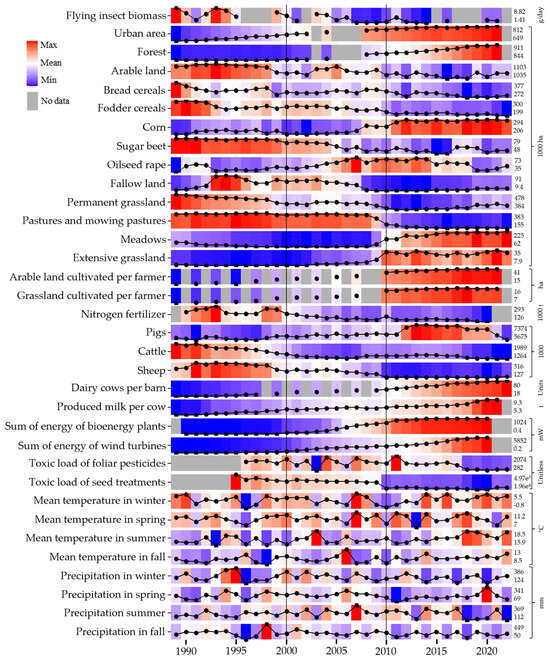 The complexity and visual correlation of potential drivers behind insect decline. The time series of selected variables spanning from 1989 to 2022 (where data was available) are depicted. Included in the presentation are the annual mean flying insect biomass (FIB), derived from Hallmann et al. [] and Mühlethaler et al. [], and various landscape, agriculture, renewable energy, climate-related variables and the toxic load of pesticides for the federal state of North Rhine-Westphalia (NRW) in Germany. Additionally, on the right side of the presentation, the minimum and maximum values for each variable are specified as well as vertical lines for visual aid. More detailed visualizations of the variables are presented in Supplementary File S5.