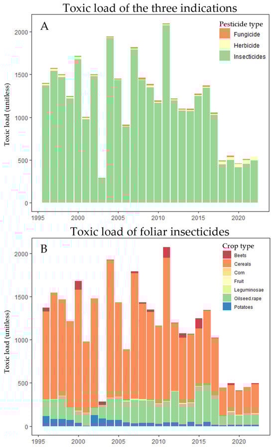 With the datasets of the market survey, the ecotoxicological endpoints for the non-target arthropod species, and the cultivated area of the respective crops in NRW, we calculated the total amount of pesticide (tons per hectare) used per crop type and year in NRW, as well as the resulting toxic load for arthropods of each active substance (unitless) weighted by the proportion of treated crop area in NRW per crop and year. A detailed description of the analyses including an example is available in Supplementary File S3. In the analyzed period, 1434 products with more than 200 active ingredients were applied in the studied region.