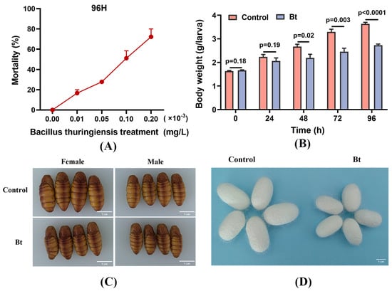 The toxicity and effect of Bt treatment on the growth of silkworms. (A) The toxicity curve of different concentrations of Bt treatment to silkworms at 96 h. (B) The effect of Bt treatment on larval body weight of silkworm. (C) The effect of Bt treatment on pupae. (D) The effect of Bt treatment on cocoons. Scale bar of 1 cm.