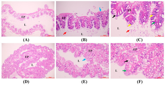 Histopathological changes in the midgut of silkworm larvae at 96 h after Bt exposure. (A–C) Represent the Bt treatment group. (D–F) represent the control group. Columnar cells (green arrow), goblet cells (black arrow), basement membrane (blue arrow), epithelium (EP), lumen (L), cells fell off (red arrow), and chromatin condensation (yellow arrow). Scale bar of 50 μm.