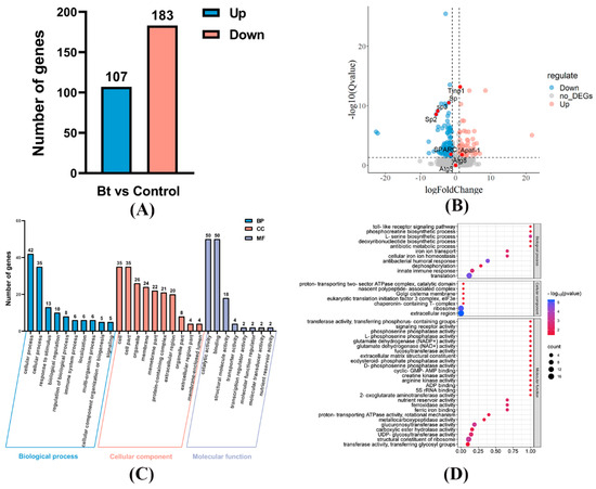Transcriptomic analysis in the midgut of silkworm larvae after exposure to low concentrations of Bt. (A) Quantities of up- and down-regulated DEGs. (B) Volcano map for transcriptomic analysis between Bt-treated and control groups. Blue and pink dots represent significant up- and down-regulated DEGs, respectively. The red dots are symbolic genes. (C) Summary of Gene Ontology (GO) classification of DEGs. (D) Dot plot of the GO enrichment analysis.