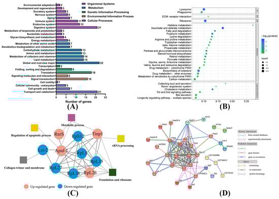 Transcriptomic analysis in the midgut of silkworm larvae after exposure to low concentrations of Bt. (A) Summary of KEGG classification of DEGs after Bt exposure. (B) Dot plot of the KEGG enrichment analysis. The horizontal axis shows the gene proportion, and the vertical axis shows the enriched pathway name. Genetic Information Processing (GIP), Cellular Processes (CP), Environmental Information Processing (EIP). The color scale represents different thresholds of p-value (p < 0.05), and the size of the dots represents the quantities of genes corresponding to each pathway. (C) The interaction diagram of apoptosis-related proteins. Different colored nodes represent different MCL clusters (find natural clusters based on the stochastic flow). (D) The interaction diagram of proteins related to apoptotic, metabolic processes; rRNA processing; collagen trimers and membranes; and translation and ribosome pathways. Gray dotted lines indicate GO pathways. Network nodes and edges indicate proteins and protein-protein associations, respectively.