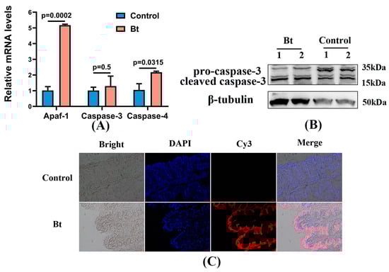 Low concentrations of Bt exposure promote apoptosis in the midguts of silkworms. (A) Transcript levels of apoptosis-related Apaf-1, Caspase-3, and Caspase-4. (B) Western blotting analysis of Caspase-3, numbers 1 and 2, represents two biological duplications. (C) TUNEL assay in frozen sections of the midguts. Cell nuclei are stained with DAPI (blue); apoptotic signal is represented by Cy3 (red). The results are expressed as mean ± SD, and the significance is determined by t-test and p-value, and p-value < 0.05 was statistically different. Scale bar of 100 μm.