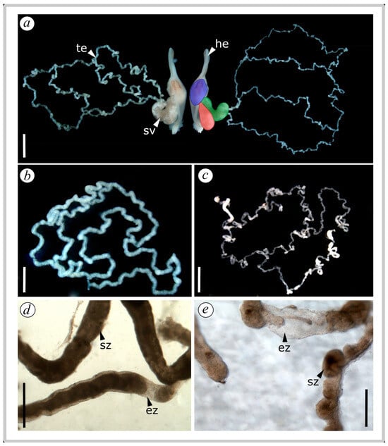 Reproductive system of Urophonius achalensis males dissected at different stages of the reproductive season, with details of the testes. (a) Hemispermatophores with seminal vesicles and testicles of males collected early in the season (left side), and towards mid-to-late season (right side). Note the difference in testicular turgidity. Color references: blue, potential ejaculate (sperm drop ready to be transferred to the female in next mating); red, store branch (blind branch of the seminal vesicle that stores sperm); green, connection branch (branch of the seminal vesicle connected to the testes). (b) Testes’ general structure of an early-season male. (c) Testes’ general structure of a male collected at mid-to-late season. (d) Details of spermatozoa in testes tubes and lumen of an early-season male. (e) Details of spermatozoa in testes tubes and lumen of a male collected at mid-to-late season. Note the presence of clearer and empty zones without sperm. Abbreviations: ez, empty-sperm zone; he, hemispermatophore; sv, seminal vesicle; sz, sperm zone; te, testes. Scale bars: a–c = 1 mm; d = 0.5 mm, e = 0.15 mm.