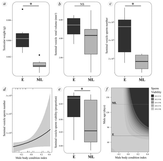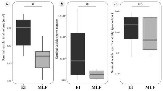 No significant differences were observed in the seminal vesicle total or potential ejaculate volume between E and ML males (seminal vesicle total volume: F = 1.359, df = 1, p = 0.274; potential ejaculate volume: F = 0.469, df = 1, p = 0.511) (Figure 2b). Additionally, these volumes were not significantly influenced by body condition (total volume: F = 0.071, df = 1, p = 0.796; potential ejaculate volume: F = 0.711, df = 1, p = 0.421) or by the interaction between body condition and experimental group (total volume: F = 0.006, df = 1, p = 0.938; potential ejaculate volume: F = 0.168, df = 1, p = 0.692).