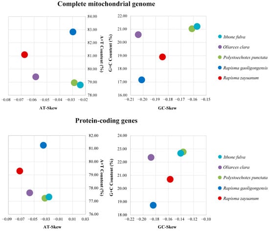 AT% vs. AT-Skew and GC% vs. GC-Skew of the whole complete mitochondrial genome, as well as the protein-coding genes, of Ithonidae.