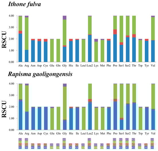 Relative synonymous codon usages (RSCUs) of protein-coding genes in the complete mitochondrial genome of Ithone fulva and Rapisma gaoligongensis. The RSCU values are color-coded based on the codons below the amino acid labels.