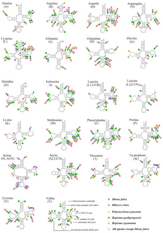 Inferred secondary structures of 22 tRNAs of the complete mitochondrial genome of Ithonidae.