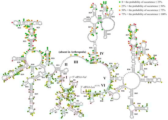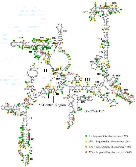 The rrnL was located between tRNALeu (CUN) and tRNAVal ranging from 1316 bp to 1327 bp long (Table S10). The A + T content of rrnL ranged from 81.50% to 83.59%. The AT-skew of the rrnL ranged from 0.00 to 0.07, while the GC-skew ranged from 0.26 to 0.34. The rrnS was located between tRNAVal and the control region (CR) ranging from 777 bp to 795 bp long. Both the AT-skew and GC-skew values of the rrnS were positive. The predicted secondary structures of rrnL of the mitogenomes in Ithonidae consisted of five canonical domains (I–II, IV–VI) and 49 helices with domain III absent (Figure 6), which is typical in arthropods [74]. The rate of mutation was higher in domain I and II, and lower in domains IV and VI. The predicted secondary structure of rrnS of the mitogenome in Ithonidae consisted of three domains and 34 helices (Figure 7). The mutation rate of each position ranged mostly from 0 to 25% in the predicted secondary structure of rrnL and rrnS with I. fulva as reference.