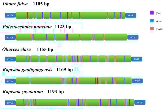 The CR in I. fulva and R. gaoligongensis was located in tRNAVal and tRNAIle. In the complete mitogenome of Ithonidae, the length of the CR ranged from 1105 to 1193 bp (Table S11). The A + T content of CR ranged from 86.43% to 94.89%. The AT-skew ranged from −0.10 to 0.01, while the GC-skew ranged from −0.57 to −0.16. Many microsatellite-like sequences such as (TA)n were present in the CR of the five complete mitogenomes of Ithonidae (Figure 8), which may facilitate the completion of DNA replication and transcription and serve as useful markers for geographical studies [68,75].
