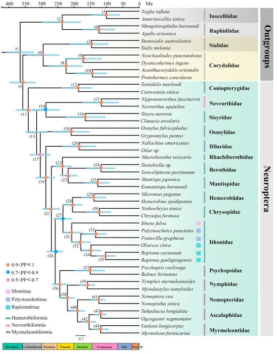 Phylogenetic relationships and divergence time estimation of all families of Neuropterida. Node numbers refer to values of posterior probabilities (PP) and estimated ages presented in Table 2. Yellow circles represent nodes with PP values above 0.9. Blue circles represent nodes with PP values between 0.7 and 0.9, and pink circles represent PP values between 0.5 and 0.7.