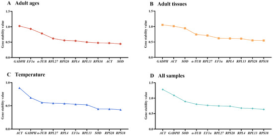 The threshold-cycle (Ct) of ten reference genes under various testing conditions were presented (Figure 1, Table S2). Among diverse adult ages, SOD exhibited smaller gene expression variations, whereas GAPDH and EF1α demonstrated greater fluctuations (Figure 1A). Across different adult tissues and under different temperature treatments, the expression fluctuations were lower in RPS18 and RPS28 and higher in ACT and GAPDH (Figure 1B,C). A combination of above results indicated that the expression difference was small in all reference genes except for ACT and GAPDH (Figure 1D).