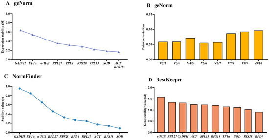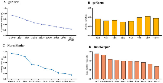 According to the NormFinder data, the rankings of reference genes were as follows: RPS18 > RPS28 > RPL13 > RPL4 > EF1α > RPL27 > α-TUB > SOD > ACT > GAPDH (Figure 3C, Table 2). Moreover, the p-values of all reference genes were less than 1.0 (Figure 3C, Table 2). The BestKeeper results indicated that RPS18 and RPS28 were the most stable, with the SD values of 0.700 and 0.914, respectively (Figure 3D, Table 2). Furthermore, the SD values of ACT, GADPH, α-TUB and RPL4 were above 1.0 (Figure 3D, Table 2).