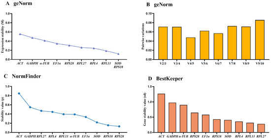 The NormFinder algorithm indicated that the stable ranking of ten reference genes from the most to the least stable were as follows: SOD, RPS18, ACT, RPL13, RPL4, RPS28, RPL27, α-TUB, EF1α and GAPDH, with the p-value of 0.091, 0.143, 0.172, 0.243, 0.268, 0.329, 0.458, 0.651, 0.849 and 0.954, respectively (Figure 2C, Table 2). The BestKeeper analysis showed that RPL4, RPS28 and SOD were the top three stable genes (Figure 2D, Table 2).
