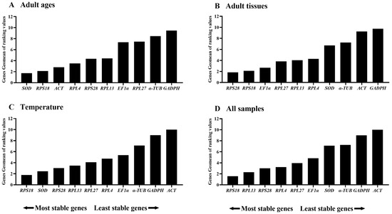 Stability rankings of the ten candidate reference genes in Epicauta gorhami computed by the Geomean method of RefFinder in different samples. The stability values are showed from the most stable (left) to the least stable gene (right). (A) adult ages, (B) adult tissues, (C) temperature and (D) all samples.
