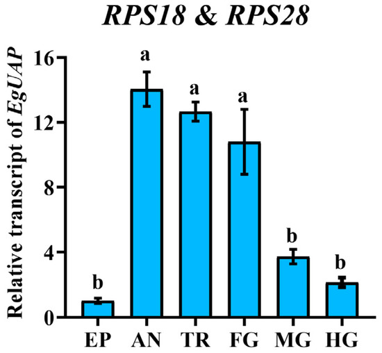 The transcription level of uridine diphosphate (UDP)-N-acetylglucosamine-pyrophosphorylase (UAP, GenBank: PQ497551) in E. gorhami was utilized to assess the stability of selected reference genes across various adult tissues. The primer sequence of UAP was as follows: Forward: CGCTACAACGTAACGCCATC, Reverse: CCCCACAATCGCTACGTTTC. The relative transcription level of EgUAP in adult tissues were computed by the 2−∆∆Ct method [23], based on RPS18 and RPS28. The SPSS Statistics 29 software (version 29.0.2.0) package was then used to evaluate the variance in expression levels of EgUAP among different adult tissues through one-way ANOVA analysis followed by Tukey’s test for multiple comparisons.