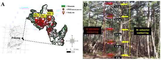Study sites and installation methods of sentinel log. (A) Location of survey sites in Pohang, Gyeongsangbuk-do, South Korea; (B) sentinel logs of M. alternatus and M. saltuarius installed at 0 m, 1.8 m, 3.6 m, 5.4 m, and 7.2 m from the ground.