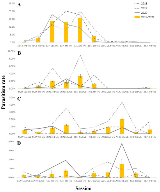 For 3 years, we surveyed the average seasonal parasitism rates of two parasitoid species. The average seasonal parasitism rate of C. flavator in M. alternatus began at 0.5% ± 0.3% in the third week of April and increased to 2.7% ± 1.0% by the fifth week of May. The average seasonal parasitism reached peak rates of 13.8% ± 2.1%, 13.2% ± 3.7%, and 15.9% ± 3.3% in the third and fifth week of June and the second week of July, respectively. The rates then decreased to 4.1% ± 2.5% from the fourth week of July and remained low from the second week of August to the third week of September. These trends were consistent throughout the 3-year study, and the parasitism rates in M. saltuarius exhibited a similar pattern to those in M. alternatus (Figure 2A,B).