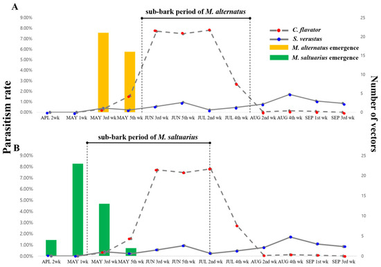 Parasitism rate fluctuation (on left axis) across the season by C. flavator and S. verustus with reference to host abundance (on right axis). (A) C. flavator and S. verustus on M. alternatus. (B) C. flavator and S. verustus on M. saltuarius. Number of captured adult M. alternatus (yellow bar) and M. saltuarius (green bar). (Sub-bark periods of both hosts = data exerted from [24,44].
