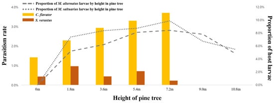 According to on our survey results, focusing on the release height rather than the forest depth and S. verustus is advantageous when mass-releasing C. flavator. According to Futai et al. [22,51], M. alternatus larvae are sparsely distributed inside pine trees below 1.5 m and reach their highest density between 5.1 and 7.8 m. Our study confirmed that the parasitism rates increased with the installation height of sentinel logs and peaked at 7.2 m (Figure 4). Consequently, our survey suggests that the preferred parasitism height of C. flavator aligns with the distribution of M. alternatus larvae. Therefore, if C. flavator is released at a height of 5–7 m on pine trees, where the larval density of both vectors is the highest, it would be an effective strategy for biological control.
