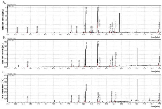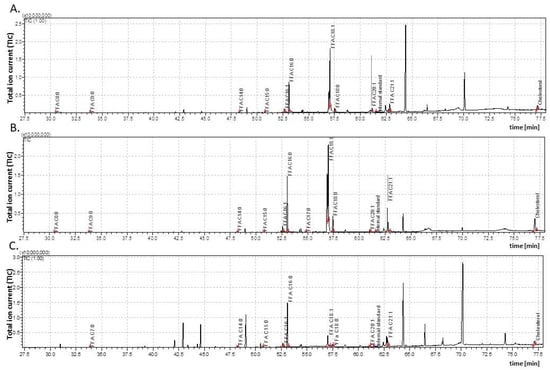 The total ion current (TIC) of fatty acids (TMSs) of the dichloromethane extract from the Galleria mellonella male pupae (A)—1-day-old (1dP-M); (B)—3-day-old (3dP-M); (C)—6-day-old (6dP-M). IS—internal standard (19-methylarachidic acid); fatty acids and molecular ions: octanoic acid (C8:0, m/z = 216), nonanoic acid (C9:0, m/z = 230), decanoic acid (C10:0, m/z = 244), tetradecanoic acid (C14:0, m/z = 300), pentadecanoic acid (C15:0, m/z = 314), hexadecenoic acid (C16:1, m/z = 326), hexadecanoic acid (C16:0, m/z = 328), heptadecenoic acid (C17:1, m/z = 340), heptadecanoic acid (C17:0, m/z = 342), octadecenoic acid (C18:1, m/z = 354), octadecanoic acid (C18:0, m/z = 356), eicosenoic acid (C20:1, m/z = 382), and 21-heneicosenoic acid (C21:1, m/z = 396). Further explanations are given in Figure 1.