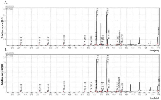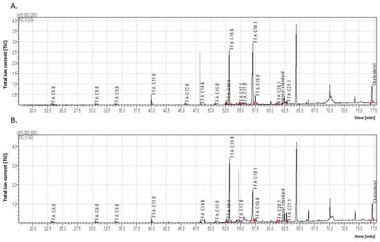 The total ion current (TIC) of fatty acids (TMSs) of the dichloromethane extract from the Galleria mellonella adults (A)—virgin female (3dA-FV); (B)—female after copulation (3dA-FC). IS—internal standard (19-methylarachidic acid); fatty acids and molecular ions: hexanoic acid (C6:0, m/z = 188), octanoic acid (C8:0, m/z = 216), nonanoic acid (C9:0, m/z = 230), undecanoic acid (C11:0, m/z = 258), tridecanoic acid (C13:0, m/z = 286), tetradecanoic acid (C14:0, m/z = 300), pentadecanoic acid (C15:0, m/z = 314), hexadecenoic acid (C16:1, m/z = 326), hexadecanoic acid (C16:0, m/z = 328), heptadecenoic acid (C17:1, m/z = 340), heptadecanoic acid (C17:0, m/z = 342), octadecenoic acid (C18:1, m/z = 354), octadecanoic acid (C18:0, m/z = 356), eicosenoic acid (C20:1, m/z = 382), heneicosenoic acid (C21:1, m/z = 396), tetracosanoic acid (C24:0, m/z = 440), and 23-hexacosanoic acid (C26:0, m/z = 468). Further explanations are given in Figure 1.