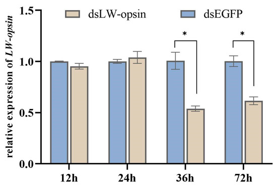 Following the injection of dsRNA (dsLW-opsin and dsEGFP), the relative expression levels of LW-opsin were quantified through RT-qPCR (Figure 1). The expression of LW-opsin had decreased by 46.82% at the 36 h time point and by 38.65% at the 72 h time point. Thus, the 36 h time point was considered optimal for conducting further RNA-Seq analysis.