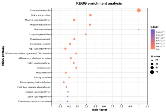 The phototransduction-fly (map04745, rich factor = 1), phototransduction (map04744, rich factor = 1), and circadian entrainment (map04713, rich factor = 0.26) pathways, which are associated with light perception, were significantly enriched (Figure 2, Supplementary Data File S3). A total of 71 genes were enriched in the phototransduction-fly pathway, 21 genes were enriched in the phototransduction pathway, and 30 genes were enriched in the circadian entrainment pathway.