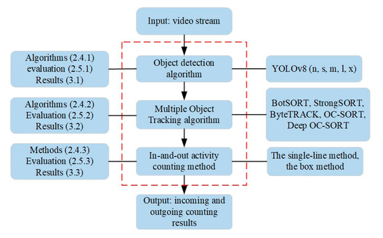 The performance of object detection, MOT, and in-and-out counting algorithms were evaluated in this study. Precision, Recall, and mAP were used to evaluate the object detection algorithms [48]. MOTA (multiple object tracking accuracy) and IDF1 (Identity F1 Score) constitute critical metrics for MOT. Precision, Recall, and the F1 score were used to evaluate the in-and-out counting methods. Moreover, FPS (frames per second) denotes the speed at which the detection model identifies targets within an image, and it is also an important evaluation metric. FPS can also be used to evaluate the speed of tracking and counting.