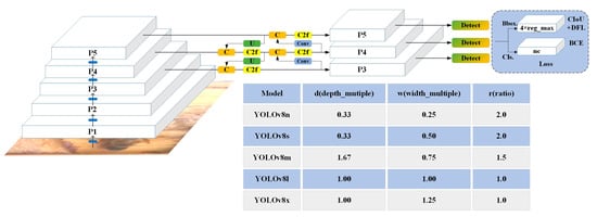 YOLO (You Only Look Once) [35], as a one-stage object detection algorithm, offers advantages such as fast speed, simplicity, and efficiency. YOLO is known for being a real-time system that predicts bounding boxes and probabilities for each grid cell by dividing images into a grid. YOLOv8 [36] is an improved model released by Ultralytics and introduces new features and improvements to boost performance and flexibility further. The structure of YOLOv8 and the parameters of different YOLOv8 versions are shown in Figure 4. YOLOv8 comprises a backbone network, a neck network, and a prediction output network. The backbone leverages convolutional operations to extract the characteristics of various scales from RGB (Red Green Blue). The neck network’s function is to perform feature fusion and enhancement. The head network is the decision-making part of the object detection model used to achieve the final detection results. The loss function of this object detection algorithm can be found in the research of Yang, et al. [37]. The parameters of YOLOv8, from small to large, are as follows: YOLOv8n, YOLOv8s, YOLOv8m, YOLOv8l, and YOLOv8x. All versions of YOLOv8 were tested.