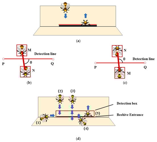 A virtual detection line is placed in front of the beehive entrance, with its length matching the width of the hive entrance, as depicted in Figure 6a. This approach is termed the single-line method and is utilized to track the in-and-out activity of bees crossing the detection line. The determination of incoming or outgoing actions is based on the vector angle. In Figure 6b,c point M is the object’s center point in the previous frame, and point N is the object’s center point in the subsequent frame. P and Q are the two endpoints of the detection line. Here, θ is the vector angle between MN and PQ. If θ > 0, the incoming counter will add 1. Conversely, if θ < 0, the outgoing counter will add 1.