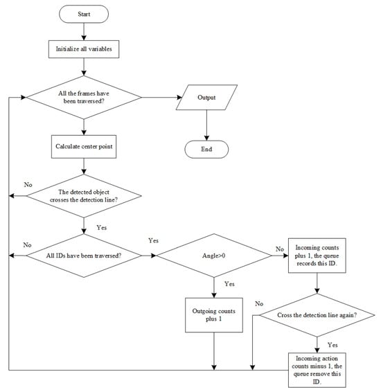 Figure 7 shows the box method algorithmic process. Firstly, multiple variables were initialized. The In-count was used to record the number of incoming honey bees, and the Out-count was used to record the number of outgoing honey bees. The video is divided into multiple frames by their number. The incoming and outgoing actions were judged through the method shown in Figure 6b,c. If a honey bee crossing the detection line is judged as an incoming bee, the In-count will add 1. If a honey bee crossing the detection line is judged as an outgoing bee, the Out-count will add 1. If a bee enters the detection box and exits immediately, the In-count and Out-count will both add 1, which results in an error. In addition, the variable (Already-counted) is a double-ended queue and can solve the mentioned error. Already-counted is used to record the ID of the honey bee that has entered the detection box. If a bee has exited the detection box but its ID has been recorded in Already-counted, the variable will remove the ID, and the In-count will minus 1. After accessing all of the objects in a frame, the next frame will access the data until it finishes all of the frames of a video. Moreover, it will output the number of incoming and outgoing bees.