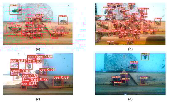 Diverse conditions involving scenarios with varying bee populations and different environmental light intensities. (a) Medium number of honey bees; (b) large number of honey bees; (c) high light intensity with shadow environment; (d) low light intensity.