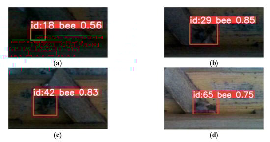 Based on the position of the camera in relation to the entrance of the bee colony and the bees’ movements, certain honey bees entered or left the beehive from below the detection line. They are, therefore, not detected, resulting in counting errors because they did not cross the detection line. The detection line being situated above the entrance of the beehive does not resolve these counting errors. Based on the line’s position of the single-line method, a new detection line was placed under the entrance of the beehive, and two detection lines were added beside the entrance, which was named the box method, as shown in Figure 6d. However, the box method presented another challenge (bee#3 in Figure 6), wherein some bees merely traverse the detection box without entering the hive directly. This problem can be solved by counting algorithm design.